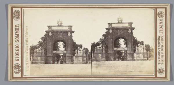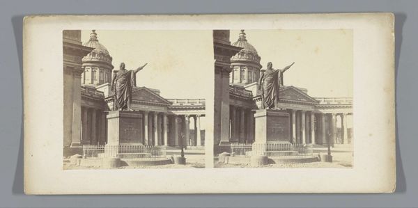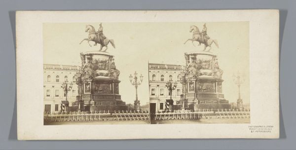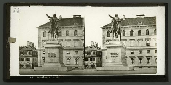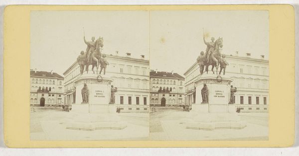 Editor: Here we have a photograph from circa 1860-1885, titled “Equestrian statue of King Ludwig I of Bavaria in Munich,” made by Georg Böttger. It's a gelatin silver print, presented almost like a stereoscopic image. The crispness of the photograph emphasizes the statue’s grand scale within the cityscape, almost isolating the scene. What stands out to you? Curator: This photograph fascinates me because it's not simply a depiction of a monument, but an artifact of production. Look closely at the process. Böttger meticulously created a reproducible image of power, a commodity intended for mass consumption. How does the choice of gelatin silver printing, a relatively new technology at the time, democratize the image of King Ludwig? Editor: Democratize? That’s an interesting choice of words, given who’s being depicted! Curator: Exactly! Consider the labor involved in producing these prints. Were these luxury items only afforded by the bourgeois, or widely accessible mementos? This connects directly to the rise of photography as both an art form and a tool of social documentation and control. Think about it—photography, even then, could be used to reinforce existing hierarchies. Editor: So you’re saying the photograph itself, the very material and method of its creation, challenges the inherent authority of the equestrian statue? Curator: Precisely! The photographic print flattens the king into a readily available, reproducible object. How does this affect the viewer’s relationship to the monument, to the king, to power itself? The materiality raises these critical questions. Editor: I hadn't thought of it that way. Seeing it as more than just an image, but as an object of production that interacts with social structures, gives me a whole new appreciation. Curator: And for me, thinking about the distribution of these prints – where they ended up, who owned them – provides an additional layer to its interpretation. The photograph’s life beyond its creation informs its meaning just as much as its initial intention.