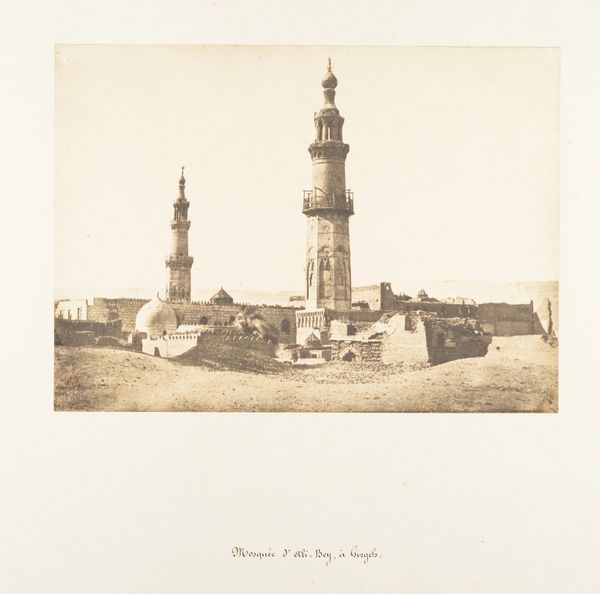 Curator: Welcome. We're standing before Maxime Du Camp's photograph, "Mosquée de Sultan Haçan, Place de Roumelich, au Kaire," a gelatin-silver print dating back to 1849. It resides here at The Metropolitan Museum of Art. Editor: The sheer massing is what strikes me first. The tonal range, that sepia wash – it almost abstracts the complex architecture, creating monumental shapes within the frame. There's an interesting interplay of shadow and light defining its cubic form. Curator: Indeed. Du Camp was among the first to use photography to document ancient monuments and cultures, part of the surge in Orientalism during that era. The Sultan Hassan mosque, an iconic symbol of Cairo, visually conveys not only architectural prowess but also the powerful cultural and spiritual influence of Islam across time and place. Editor: I’m particularly drawn to how the composition isolates the mosque against what appears to be a minimalist landscape, which sharpens its outline and simplifies the visual narrative. We almost get a graphic reduction of form and cultural objecthood in one fell swoop. What could be read in the context of this historical, cultural positioning? Curator: I'd say it’s crucial to observe that isolation in the frame and the time when it was created; 1849. This photographic perspective emphasizes the imposing permanence of Islamic identity amidst an environment potentially interpreted as undefined or perhaps implicitly "other." The architectural elements become symbols of steadfast faith and continuity in a rapidly changing colonial world. Editor: Right. The contrast accentuates a cultural divide as perceived, captured, and reproduced by European eyes through photography. So the work embodies the visual structure inherent within colonial viewpoints, highlighting dominant and subordinate entities. Curator: Absolutely, it is a photograph that makes us examine what symbols we project on this architectural wonder. What lasting images are reproduced and memorialized across time. Editor: Considering Du Camp's technique alongside these contexts has provided some additional interesting layers to view. Thank you for this fresh look at this gelatin print!