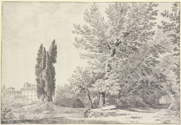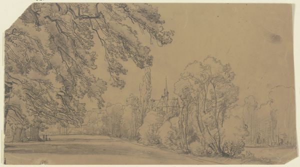 Editor: This pencil drawing, "Forest Cemetery" by Heinrich Funk, was completed in 1876. The scene feels so quiet and contemplative. What do you see in this piece, beyond the initial impression of a peaceful burial ground? Curator: Well, beyond the obvious imagery of death and remembrance, I see a profound meditation on nature and time. Note how the trees, particularly the tall, slender ones reaching towards the sky, echo the verticality of the gravestones. Are they not also markers, signifying growth, decay, and the cyclical nature of life, much like the cemetery itself? The clouds contribute, too, indicating temporality and the changing character of light and time passing. Editor: That’s an interesting perspective. So, it's less about the individual lives remembered and more about the broader cycle? Curator: Precisely. Consider also the cultural context. In the late 19th century, there was a growing romanticization of nature, juxtaposed with a deep fascination with mortality. Forests themselves were often imbued with symbolic weight, representing both the untamed wilderness and a spiritual refuge. Editor: And the cemetery combines these ideas? The cultivated nature serving as a buffer against raw wilderness? Curator: An astute observation. The cemetery becomes a curated landscape of memory, mediating between nature and human existence. Even the pencil medium feels relevant, offering a soft, almost dreamlike quality, suggestive of memories fading with time. What feelings does it stir in you? Editor: It’s made me reflect on how landscapes can contain so many layers of meaning, reflecting both personal and cultural histories. I never considered the forest as such a symbolic space. Curator: And I find myself appreciating the quiet eloquence of the drawing, the way it transforms a seemingly simple scene into a complex meditation on life, death, and memory. It makes you wonder what the forest will claim in the years to come.