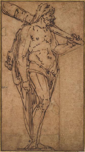Michelangelo sketched this nude male figure, a study for his "Battle of Cascina," using pen and ink on paper. The stark contrast of ink on the page creates a dynamic interplay of light and shadow, giving the figure its powerful presence. Notice how Michelangelo builds up the form with layers of hatching, particularly in the torso and legs. This additive process, a kind of sculptural approach to drawing, emphasizes the body’s muscularity and tension. Drawings like this were crucial to Michelangelo's practice. As a sculptor, he relied on preparatory sketches to explore form and composition. But these drawings were not merely functional. They also served as a means of intellectual exploration, a way for Michelangelo to grapple with the complexities of the human form and his artistic vision. By understanding the materials and processes, we can appreciate the intense labor and intellectual engagement that went into creating this seemingly simple sketch. This challenges the divide between art, craft, and the artist's broader intellectual pursuits.