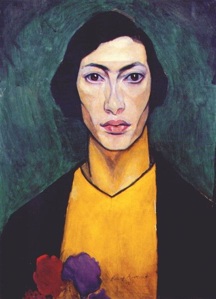 Editor: So, here we have Lucian Freud’s “Girl with Roses,” painted in 1948. It's oil on canvas, and the texture seems very smooth. There’s a stillness to the painting but also something unsettling in the woman’s gaze. What do you see in this piece? Curator: Immediately, the rose motif jumps out. We have the vibrant rose held in her hand and then a fallen bloom resting in her lap. Roses are commonly associated with love, beauty, and sometimes death. What strikes me here is how Freud subtly distorts conventional symbolism. Editor: Distorts? How so? Curator: Consider the woman’s gaze. She’s not looking directly at us; her eyes seem almost mismatched, suggesting perhaps unease or a detachment. Now, consider the rose in her hand. It has thorns and that single leaf; Freud hasn't prettified it. The symbolic meaning becomes layered with complexity, perhaps questioning idealised beauty. Roses are also fleeting, ephemeral. Freud might be alluding to the transience of beauty or innocence, which would have a deeper meaning after WWII. Editor: So, the roses aren't straightforward symbols of love. They suggest something more complicated. It makes me think about vulnerability. Curator: Precisely. And consider the setting. The stark, flat background and her dark, somewhat severe clothing contribute to a mood that's more contemplative than celebratory. Can a flower both conceal and reveal an underlying emotion? Editor: I never thought about the power of subtle symbolism like that before. Seeing those visual cues, even a single rose, can lead to much deeper cultural meanings. Curator: Exactly! The artist becomes a kind of storyteller using symbols to evoke responses in the viewer, opening channels to cultural memory. There is an awareness in modernism, in Freuds' art, of this powerful interplay.
