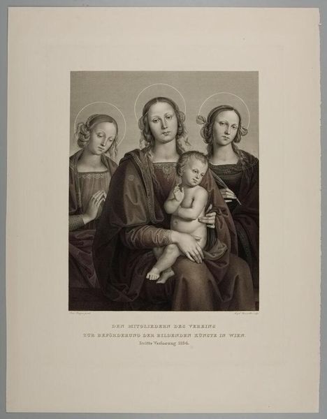 Curator: Here we have August Hoffmann's "Madonna with Saint Jerome and Saint Francis", currently residing at the Harvard Art Museums. Its monochrome rendering gives it a somewhat somber tone. Editor: It does feel subdued. The grouping of figures creates a really intimate space, despite their detached gazes. Curator: Hoffmann, born in 1810, situates this piece within a long tradition of religious iconography, but it also speaks to 19th-century attitudes towards faith and representation. We must consider the politics of its production. Editor: Absolutely. And considering the dynamics—the Madonna centrally positioned, holding the child—how does it reinforce or challenge societal expectations of women and motherhood during that period? Curator: It's an idealization, certainly, yet the sobriety strips away overt sentimentality, perhaps reflecting anxieties surrounding religious belief in an era of rapid social change. Editor: That tension between the traditional and the contemporary makes it such a compelling piece to consider through a modern lens. Curator: Precisely. It continues to spark dialogue about art’s role in shaping our understanding of faith, gender, and power. Editor: An enduring power, indeed.