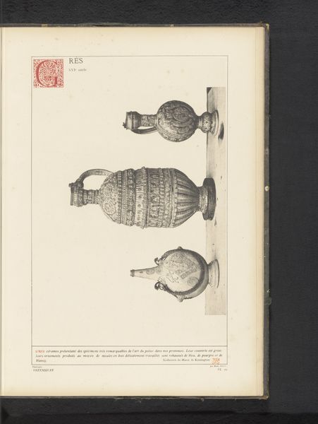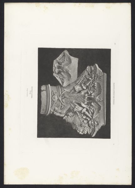 Curator: Let’s examine this photographic print titled *Shoulder Piece of Armor* dating between 1850 and 1900, attributed to Médéric Mieusement and housed here at the Rijksmuseum. Editor: Woah, there's a peculiar ghostly feel here; it's almost like an artifact conjured right from a fable. And what detail, despite the age of the piece! Curator: Mieusement's print work here allows us to consider a critical historical record of material culture in relation to print production. The detailed engravings etched on the armor are still sharply visible here and speak to craftmanship, circulation, and social value during this era. Editor: True! What’s also catching my eye is this stark juxtaposition of violence, history, and protection immortalized in sepia tones, like warriors captured mid-battle, miniaturized. Almost making them sweet. Curator: It showcases a moment of transformation, perhaps, for both the materials, as well as representational form. Look at the contrast between the utilitarian design of the armor itself and the very academic artistry that seems to literally cover it. Editor: Exactly! It begs the question, wouldn’t something so ornate actually be quite impractical? Or is that point completely irrelevant in this particular case, superseded only by its symbolic, or, let’s be real, artistic intention? Curator: Such tension indeed underscores a core function: social signaling, demonstrating a patron’s taste, wealth, and allegiance to broader historical narratives celebrated during this period. The armor and this print about armor. Two means of display in dialogue. Editor: That is an intriguing perspective, I had not fully considered it, as just this tangible link to our past made immortal. It sort of hints to the fact that it doesn’t take much to take functional and transform it to sublime. Curator: Right. From these materials, to labor, and how cultural meaning accrues—we begin to understand value and historical record beyond a linear timeline. Editor: Exactly, almost to the point that history can truly echo, resonate through images like these, it is kind of humbling, actually.