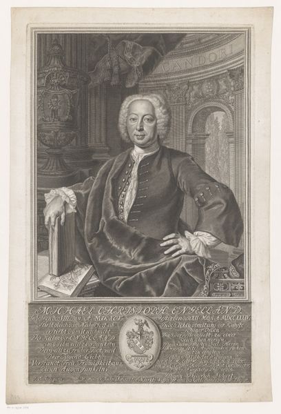 Curator: This etching, residing here at the Rijksmuseum, is a portrait of Johann Friedrich Nolte. Johann Martin Bernigeroth created it in 1755. Editor: It possesses a rather stark elegance, doesn’t it? The limited tonal range accentuates the texture and detailed rendering of the sitter’s clothing and the drapery behind. There’s an intriguing interplay between formality and… a slight aloofness in his expression. Curator: Aloofness isn’t surprising given that, at the time, this Nolte served as Conrector of the Ducal School of Schöningen. Editor: The engraver certainly captures his station. Consider how the lines, though delicate, are deployed to model form. Observe also the compositional arrangement—the architectural element placing him in a proscenium, or above us, subtly reinforcing his authority. Curator: The composition situates Nolte centrally within an elaborate cartouche, a visual symbol underscoring the importance society gave to men of letters during the Baroque era. I think it also points to larger institutional mechanisms and the desire to record important members of educational institutions. Editor: Indeed. But zooming in closer on that same Baroque detailing – specifically that intricate scrollwork framing the inscription – the effect becomes almost dizzying. It fights with the relative clarity of the subject, disrupting the visual field with excessive ornamentation. Curator: Yet that very tension, perhaps, highlights a crucial social point. Such conspicuous embellishment wasn't merely aesthetic; it visually communicated the values and hierarchies underpinning 18th-century society. Consider, this was an era of rigid social strata and outward shows of status, with this image potentially serving as an idealized and somewhat manufactured image for wider consumption. Editor: A manufactured image, I concede. And a very well constructed one too, prompting deeper exploration of the strategies and artistic vocabularies underpinning Baroque portraiture as a whole. Curator: I would say it provokes thoughts around what, exactly, portraits like these accomplish in a broader societal context. They certainly have to reflect real people to some extent, yet this one has a strong propaganda element that deserves recognition.
