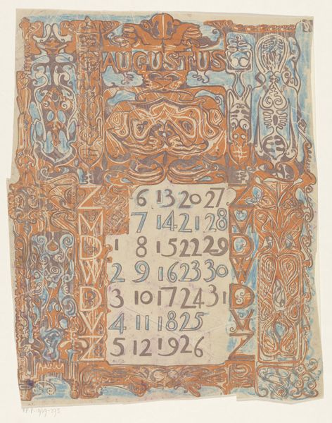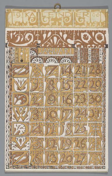 Editor: This is Theo van Hoytema's "Kalenderblad voor maart 1913 met hanen," created around 1912 using linocut print techniques. The detailed depiction of the roosters, combined with the calendar format, feels both rustic and purposeful. How do you interpret the symbolism of these roosters in this calendar? Curator: Considering Van Hoytema’s socio-political leanings, particularly his involvement in animal rights, it's likely the roosters transcend mere aesthetic appeal. What might these roosters represent about societal structures or the exploitation of animals, specifically within the context of 1912, when industrialization was rapidly changing society's relationship with the natural world? Editor: I hadn't considered it that way. The roosters could be symbolizing resistance or perhaps a call to return to simpler, more ethical ways of living? Curator: Precisely! Think about the Art Nouveau movement Van Hoytema was associated with, known for rejecting industrial aesthetics. The presence of these stylized birds, in that light, functions as a potent symbol, advocating for a reimagined future rooted in social justice and ecological consciousness. The calendar itself – measuring time – becomes a space to challenge our preconceived ideas. Editor: That makes so much sense. It shifts my perspective completely. Curator: What seemed initially like decorative choices are laden with layered meaning that reflects both artistic and socio-political convictions. Do you see any connections to contemporary environmental concerns, for example? Editor: Absolutely. This makes me realize the importance of examining not just what's on the surface but also the artist’s intentions and societal background when interpreting any artwork. I’ll definitely remember to do my research moving forward.
