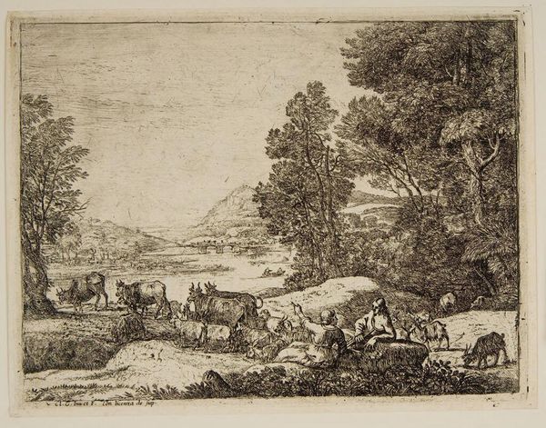 Curator: This is Claude Lorrain’s etching, "Shepherd and Shepherdess Conversing in a Landscape," likely created between 1646 and 1656. What's your immediate impression? Editor: Intimacy. I get the sense of a private, almost Edenic moment shared. It’s less about the vast landscape and more about the figures within it. It's soft. Ethereal, even, like a daydream rendered in ink. Curator: Indeed, the composition positions the viewer to engage with a harmonious arrangement. Note the foreground—how it frames the subjects, establishing a classical pictorial structure through the strategic application of dark and light. It invites one into the heart of the artwork's subject matter: balance, tranquility, and a reflection of an ideal pastoral scene. Editor: Yes, a balance achieved almost precariously through detail. It almost feels overwhelming with all that baroque foliage, but he pulls you back in with the delicacy of those conversational tones between the shepherds, which feels intimate despite the vast openness around them. There’s something human there, nestled within nature’s exuberance. It speaks of humanism, a conversation within nature. Curator: That tension you sense is integral. It exemplifies Lorrain’s mastery of etching; observe how light mediates the intricate textures of foliage, earth, and animal form. The varied densities create a spatial push-and-pull, reinforcing that classical aesthetic but viewed through a softer lens. Editor: The scene feels frozen, though; like some tableau, they're stuck in. I imagine they are contemplating. Look at their placement within the picture: slightly elevated but still so small compared to everything around them. Despite it being idyllic, there’s this echo, like mortality knocking lightly at the gate to paradise. Curator: A compelling assessment! So, after this visual meditation, do you find that you perceive and engage with it differently now than before? Editor: Absolutely! At first, the sheer intricacy of technique dominated, yet it is also very interesting. The conversation, both depicted and invited, holds far more now, making this quiet artwork shout a lot!