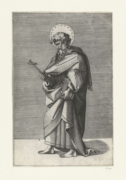 Curator: Let's delve into this engraving by Marco Dente, created between 1517 and 1527, currently held at the Rijksmuseum. It’s titled "Apostle Philip with Cross". Editor: Wow, Philip looks so…contemplative. Like he's about to drop the hottest take on the Gospel, or maybe he just stubbed his toe. The etching feels a little severe. All that careful linework emphasizes weight—both of the fabric and maybe his…burden? Curator: Indeed. Dente, known for his reproductive prints after Raphael, situates Philip within a rich theological tradition, underscoring the weight of religious history. The cross he carries and the book he clutches are symbols fraught with power. We should consider too the social context and rising debates over religious authority during the Reformation. How might viewers during that era read this work? Editor: Reformation reflection...okay, I get it. So this isn't just "bro with cross," it’s about grappling with scripture and power structures. But also, can we talk about his feet? The bare feet are like this vulnerable counterpoint to all that heavy fabric and those symbols of authority. It kinda brings him down to earth, you know? Makes him feel... human. And that halo? Is that a dig, or some form of acceptance? Curator: A perceptive observation! Those bare feet serve as a signifier of humility but, one may ask: humility before whom, and at what expense? And regarding the halo, while signaling divinity, it’s presented here without ornate embellishment. This stripped-down depiction raises important questions around saintly representation and how the divine is accessed. Editor: So, we’re basically looking at Renaissance fan fiction. It's taking a popular character from religious stories and making you rethink their entire vibe. Like, "What if Philip had doubts?". I like the subtle storytelling, it does ask for you to pause. Curator: Exactly! Dente’s engraving invites critical reflection on belief and authority in a turbulent time, resonating with concerns that still echo today in broader dialogues about institutional power. Editor: It makes you want to ask this Apostle Philip some questions... or at least buy him a comfy pair of sandals.