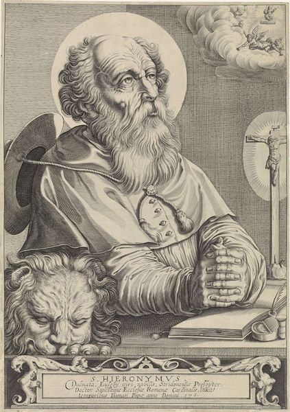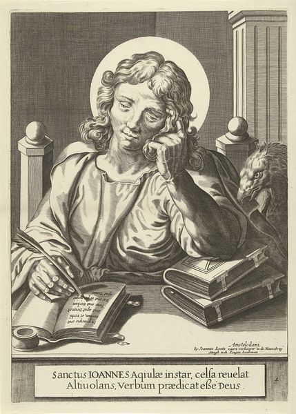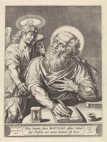 Editor: So this is "Evangelist Marcus," an engraving made by Egbert Van Panderen sometime between 1590 and 1637. The detail is incredible for a print, but the saint himself looks...melancholy? And what’s with the intense lion looming behind him? What do you see when you look at it? Curator: Immediately, I'm struck by the contrasting textures. The smooth planes of Marcus’s face, halo, and the stark tabletop, juxtaposed with the intricate hatching used to create the illusion of the lion’s mane and the drapery folds. How does this distribution of textural detail guide our eye, would you say? Editor: Well, the contrast definitely makes the lion stand out more than it would otherwise. It sort of balances the brightness of the halo above Marcus. Curator: Precisely. Note also the light source. It seems to originate from above and to the left, casting deep shadows that model Marcus's features and add drama. Consider how the artist uses the formal qualities of light and shadow to amplify the emotional weight of the piece. Is it merely a symbolic attribute, or something more complex, structurally speaking? Editor: I hadn't thought about that. The light *does* seem to sculpt the face. It brings attention to his weariness, like the writing is hard labor. Maybe the light isn't just symbolic, but… almost another character. Curator: Indeed. We observe then, a masterful interplay of composition and texture contributing to the complex emotional register, inviting closer contemplation on how structure itself can shape narrative. What have you garnered from the dialogue, specifically, today? Editor: Paying closer attention to the use of light and texture – it's made me see how the artist uses every element to create a really immersive emotional space, far beyond just depicting a historical figure.