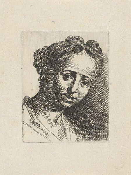 Editor: This is "Woman with string of pearls in her hair looking downwards to right," an etching from 1645 by Wenceslaus Hollar, housed at the Metropolitan Museum of Art. There's something so delicate about her downcast gaze. It feels incredibly intimate. What stories do you think the symbols and imagery are telling here? Curator: Indeed, that downward glance is key. In the 17th century, depictions like these were often tied to specific cultural codes. The pearls themselves, beyond mere adornment, suggest purity and even, in some contexts, tears. Do you notice how the artist has positioned the pearls? Almost like a halo, hinting at an inner light. Editor: Yes, I see that! It makes her seem almost saintly, even though she's presented in such a simple way. Is there a connection between the pearls and her lowered eyes, perhaps suggesting humility? Curator: Precisely. Think about the cultural associations of the time. Pearls were costly. Their presence can indicate status but her averted gaze offers a counter narrative, potentially rejecting vanity. This juxtaposition invites reflection: How do external symbols relate to inner character? Is this woman presented as virtuous or contemplative or perhaps burdened? Editor: It's fascinating how something as small as a string of pearls and a tilt of the head can carry so much weight. I had never considered those layers of interpretation before. Curator: Images speak volumes beyond their literal representation. Visual elements become vehicles for transmitting values and collective memories. So the artist uses those cultural cues in conjunction with form and presentation to express their interpretation. Editor: It’s almost like Hollar is using a visual language I'm just beginning to learn. Curator: And you will, layer by layer!