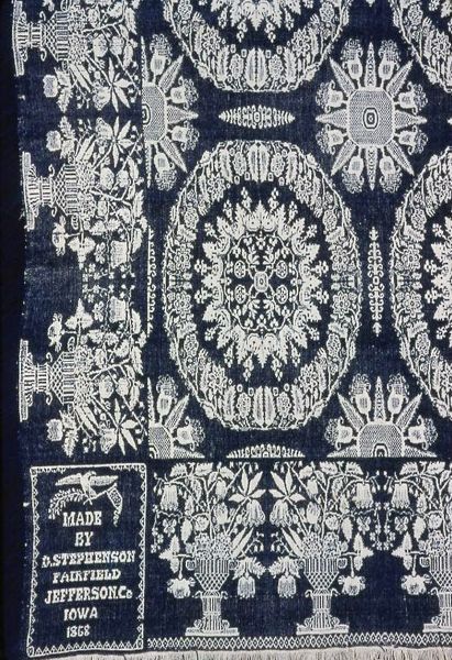 Editor: This textile artwork, a coverlet, was created in 1839 by John B. Welty. It is crafted from wool using weaving techniques. The detailed patterns are captivating. I'm particularly struck by how the different motifs are organized and repeated. What elements stand out to you from a structural standpoint? Curator: Immediately, the emphatic geometric arrangement captures attention. Notice how Welty juxtaposes the rigid, almost architectural grid with organic, stylized motifs: floral blooms, avian forms. The limited color palette – primarily indigo, madder red, and a natural wool tone – functions not for mimetic representation, but as a means of articulating structural relationships, accentuating the warp and weft, underscoring the textile's inherent materiality. Editor: That's interesting. I was thinking about the narrative embedded in the imagery, but you're leading me towards understanding the pure structure first. Is there a particular compositional strategy you see at work here? Curator: Indeed. Observe the clear delineation of the border. The lower register containing the maker's name, flanked by stylized figures, anchors the overall composition. The subsequent fields exhibit rotational symmetry around a central axis. Furthermore, consider how the fringe operates: less as mere adornment, but rather, an extension, an outward manifestation of the warp threads, a physical instantiation of the underlying structural grid. It challenges traditional notions of "art" versus "craft" through its inherent functionality and intricate formal complexity. Editor: So it is about the push and pull between order and artistry? It's functional, yet aesthetically intricate... the materiality drives the beauty! Thank you. I never thought about a coverlet in quite this way. Curator: Precisely. By rigorously examining the internal relationships of form and material, we begin to uncover a rich aesthetic experience.