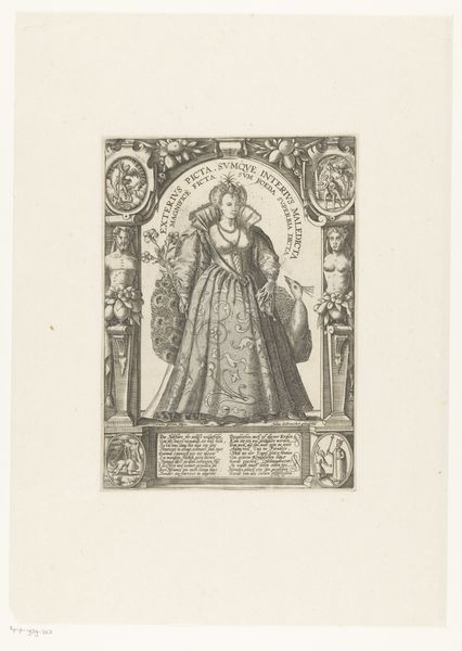 This is an anonymous portrait of Ada, Countess of Holland, a print held at the Rijksmuseum. Ada is depicted with a heraldic shield bearing the lion rampant, a symbol of courage and nobility deeply rooted in medieval heraldry. Observe the gesture of Ada's raised hand, a motif that echoes across centuries and cultures, recalling both the 'ad locutio' of Roman emperors and the blessing hands of early Christian saints. This same gesture, imbued with authority and supplication, resurfaces in Renaissance art and beyond, revealing its enduring power to convey leadership and appeal. The image resonates with the viewer on a subconscious level, evoking feelings of respect and perhaps even a longing for the stability of bygone eras. The skull, or 'memento mori', reminds us of the transience of earthly power and the inevitability of death, a theme that has permeated art from ancient Roman mosaics to vanitas paintings. The presence of such symbols suggests a cyclical view of history.