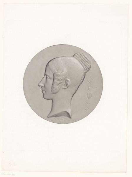 Editor: So, this is a print called "Medaille met portret van André Étienne d'Audebert de Férussac," made after 1833 by Achille Collas. It’s an engraving, a pretty classical looking portrait. The lines are incredibly fine, creating this almost photographic quality. I am interested in what you notice in the composition, considering the classical portraiture and engraving methods at play. Curator: Indeed. Immediately striking is the severe profile. Note the rigidness, almost stony. What does the artist achieve by flattening the volume into an almost bas-relief quality through line work alone? The textures are rendered economically, no doubt, with a strategic variation in the depth and weight of the engraved lines. Observe, as well, the curious placement of the inscriptions that border the figure within a defined geometric space. How do those graphic details impact the artwork's visual organization? Editor: It seems like the figure becomes a kind of intellectual object, more about representing a specific idea than capturing any personality. Curator: Precisely! Collas removes personal expression to instead invoke idealized form. It highlights intellect and permanence above the fickle impressions of the everyday. We must ask ourselves: does it fully succeed in that task? Editor: That makes perfect sense. I hadn’t considered how much the artist has eliminated the human element to elevate the portrait to an idea. Thank you! Curator: It is my pleasure. Formal analysis reveals fascinating conceptual decisions!
