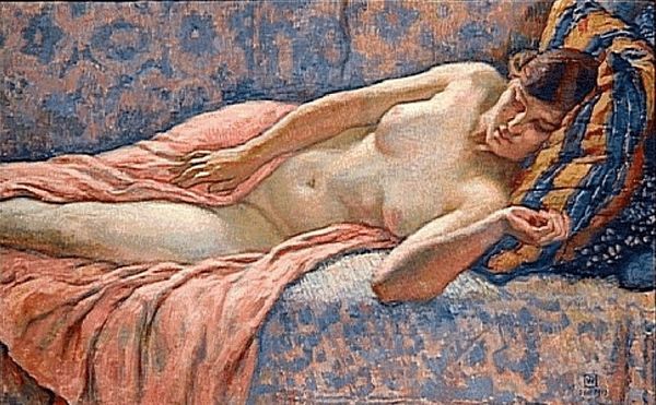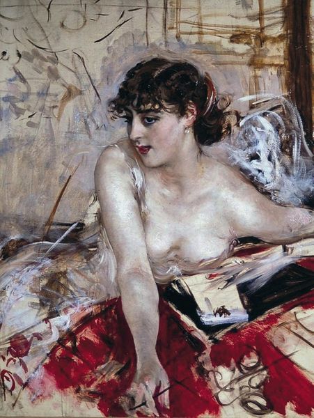 Curator: This is Theo van Rysselberghe’s "Woman at Her Toilette," painted in 1905. He’s known for his shimmering, light-filled Neo-Impressionist canvases. Editor: It’s incredibly intimate. The first impression is a warm, golden light— almost like being enveloped in a hazy, summer morning. There’s a tenderness despite the obvious gaze at a nude body. Curator: The female nude as a subject connects back to a long tradition in art history. Rysselberghe's approach departs from older traditions in interesting ways: while her nakedness is visible, she does not need to avert her eyes and is given a very real dignity in an otherwise commonplace setting. Editor: Yes, I appreciate that he’s positioning her within an intimate space, seemingly unbothered by an audience, reclaiming some sense of autonomy from the artist's gaze. The accoutrements of grooming signal a ritual of self-care, rather than performance. Curator: Absolutely, these details also tap into the turn-of-the-century fascination with intimism, a quiet celebration of domestic life and private moments. Look at how he uses pointillism here. It's not just about rendering light; it almost feels like he's building up layers of memory, tiny fragments of experience coalescing into a cohesive whole. Editor: It speaks to the complex interplay between objectification and empowerment when representing the female body, a subject made incredibly complex at the turn of the last century. And it seems fitting to approach the painting with similar complexity. Curator: I agree. Looking closely, I think the persistence of intimate moments over time becomes the larger symbolic message embedded within. It invites us to contemplate the weight of the ordinary, and in its beauty, locate ourselves in a continuous cultural stream. Editor: It encourages us to look not only at who is being seen, but who is doing the looking, and the myriad factors influencing that gaze. To what degree do representations empower or further subordinate in ways easily missed by the uncritical eye? This seemingly uncomplicated painting prompts some rather provocative and difficult questions.