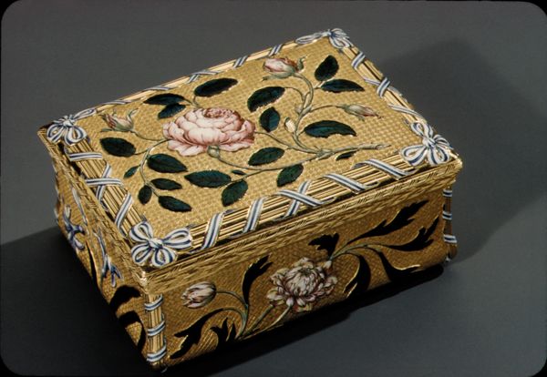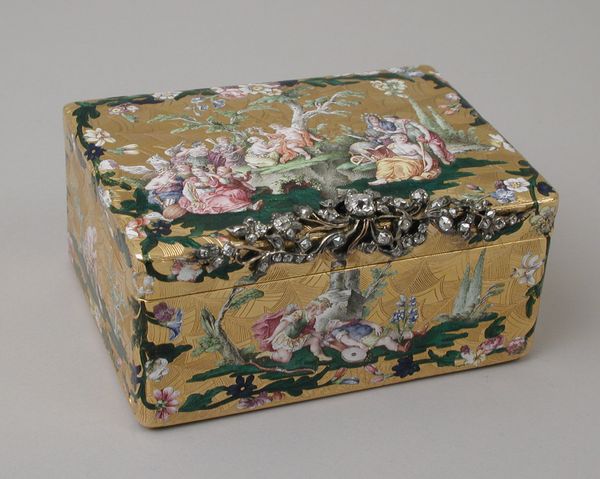 Editor: Here we have a covered quillwork birchbark box, made by an Anishinaabe artist, probably in the 20th century. I’m immediately struck by the contrast between the rigid, geometric shape of the box and the delicate, floral designs. What can you tell me about it? Curator: Well, let's think about the process here. Birchbark isn’t just lying around, ready to be used. Harvesting, preparing, and then decorating it with quillwork… it’s all labor, isn't it? This wasn’t just 'art'; it was work. A way of transforming materials from their natural state into something both beautiful and functional. And don’t overlook those plant motifs—they tell a story, right? They speak of the artist’s deep engagement with the natural environment and available raw material, birch. Editor: So, you're saying that this box isn’t just a pretty object, but also a record of the labor and knowledge involved in its creation? It challenges the distinction between 'art' and 'craft?' Curator: Precisely. This challenges the idea that art exists in some separate, rarefied realm. Look at the geometric shapes as well, those x shapes between the flowers, these repetitive, careful details make us consider both individual artistry, cultural pattern and larger systems of knowledge. Who created those materials, who designed and taught these techniques, who would use or purchase the boxes? What do all of those actors tell us about the artwork? Editor: That makes me think about the social context, too. Was this box made for trade, for personal use, or for something else entirely? I wonder about that relationship to an exchange of value. Curator: Exactly! And the materials themselves—bark, quills—these tell a story about resourcefulness, about making use of what’s available. Perhaps its for decoration, but I wonder how such craft becomes trade commodity. What has the journey been, and where do things travel to and from? It makes me rethink value, doesn’t it? Editor: I never thought about decorative art being connected to broader consumption, cultural labor and materiality in that way. Thanks for bringing this perspective to light. Curator: Absolutely! Thinking about art as more than just aesthetics, but as part of larger economic and social systems really opens up our understanding, doesn't it?