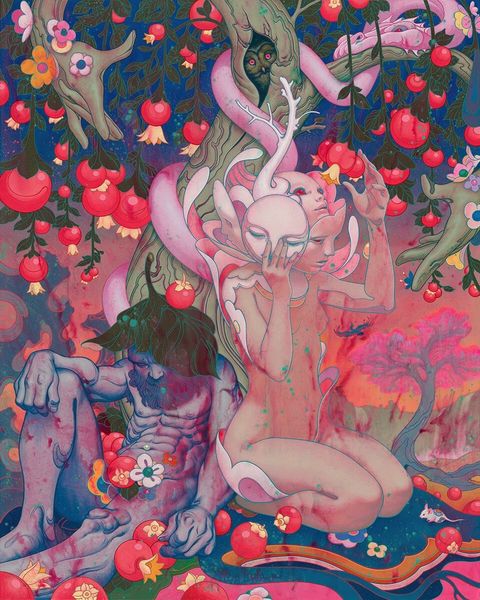 Editor: Here we have Daria Theodora’s watercolor painting, “Say Hi to Poppy,” created in 2018. It’s dreamy and strange, like a half-remembered fairy tale. What do you see in this piece, beyond the surface? Curator: It’s interesting you call it a fairy tale. I see it as a potent intersection of nature, femininity, and the surreal. Consider the poppies, traditionally symbols of sleep, death, and remembrance, almost consuming the figure. Do you think that evokes any particular narrative about the female form and its association with nature? Editor: Maybe the way women are often perceived as being 'closer' to nature, sometimes in ways that limit them? But the painting also feels empowering. Curator: Precisely! The act of embracing the puffin, surrounded by symbols of nature, challenges those restrictive associations. This recalls the work of feminist artists reclaiming the female body from the male gaze. Note how the traditional ‘nature’ symbols intersect with her stylish shoes, perhaps indicating a defiance against such restrictive roles? Editor: I hadn't thought about her boots in that way, but it makes sense now. It disrupts a singular read, adds layers. Curator: Yes, the floating land masses, with their mix of flora and fauna, defy conventional landscapes. How does that unconventional presentation inform the piece’s themes, perhaps speaking to migration or displaced identities? Editor: Maybe the dream-like quality hints at unconscious biases regarding identity and how we interact with nature? Curator: That’s astute. Ultimately, “Say Hi to Poppy” uses whimsical imagery to address profound issues concerning identity, our relationship to nature, and our perceptions of femininity in a very complicated way. Editor: It makes me appreciate how contemporary artists like Daria Theodora engage with feminist discourse in their creative process.