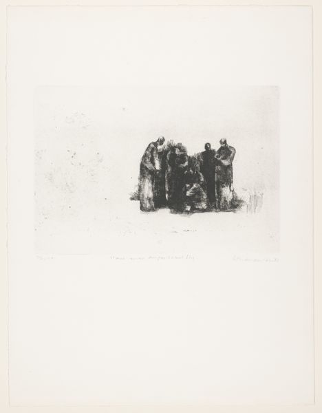 This print, made in 1861 by an anonymous artist, depicts skaters guiding King William III through a flooded landscape. The printmaking process itself is key to understanding the artwork’s purpose and impact. The image is a reproduction, allowing for wider distribution than a painting. This connects it to the industrialization of image-making and the rise of mass media. The choice of subject matter – a monarch being aided by ordinary citizens – is significant. The print highlights the King's reliance on the local populace during a natural disaster, emphasizing a narrative of shared responsibility and national unity. The image’s texture and tonal range depend on the specific printing technique used. This process, which might involve etching or engraving, dictates the level of detail and the overall aesthetic quality. This artwork invites us to consider the social and political implications embedded within the printmaking process itself.