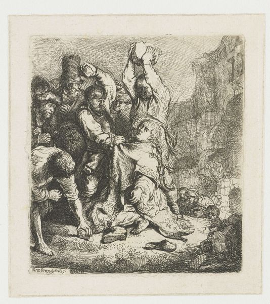 Editor: Here we have Martin Petersen’s etching "Stevedores," created in 1919. The rough lines give it a hurried, industrious feel. What can you tell me about this portrayal of labor? Curator: What immediately strikes me is the intense physicality evident in Petersen's technique. The etching lines, the very material record of the artist's hand, mirror the strenuous labor depicted. This wasn't painted, it was etched, a process involving physical force. The printmaking medium connects conceptually with the labor being depicted: It is the multiplication and distribution of work. Editor: I hadn't thought about the etching itself as a form of labor. So, do you see the choice of medium as commentary? Curator: Absolutely. Petersen isn’t just representing stevedores, he's implicating himself, and by extension us, within a system of production and consumption. The date, 1919, is also significant. What's happening socially and economically at this time? How does the materiality of the barrels factor into trade and colonial exploitation? What gets loaded, where does it go, and what impact did it have on both the consumer and the laborer? Editor: That makes me think about the composition—they're enclosed, almost trapped, by their labor. Curator: Precisely. And the artistic process mirrors the stevedores’ actions: it involves the making of something through labor. Consider what this print was intended for - to be purchased, owned, consumed. The cycle of production, both artistic and industrial, continues. How might viewing this through a gender lens shift your thinking around labour, materiality and process? Editor: It all comes back to the physical processes and social forces shaping both the art and the lives it portrays. Thank you! Curator: My pleasure. Hopefully, this gives you a bit of an expanded view regarding not only material and concept but process, too.
