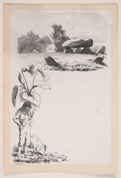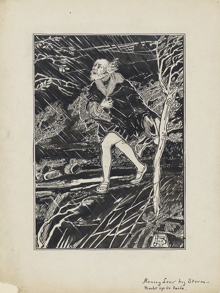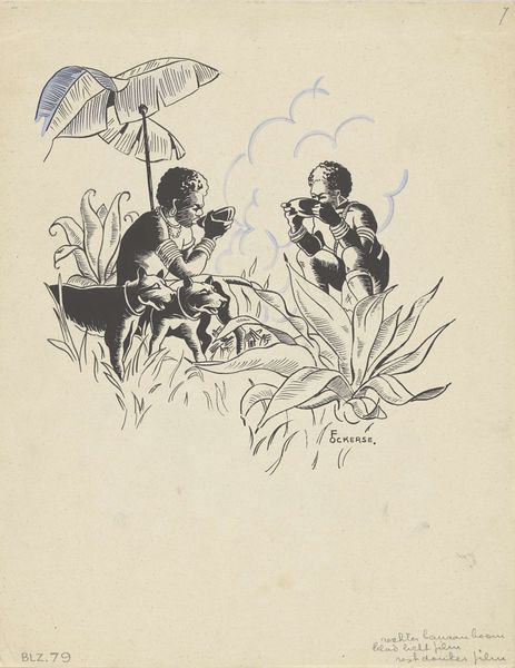Curator: What an arresting image! There's something so viscerally immediate about this artwork by Hans Borrebach. It’s an ink and pen drawing, possibly created anytime between 1913 and 1970. It's titled *Jongen probeert met een stok over een sloot te springen*, or in English, *Boy Trying to Jump Over a Ditch with a Stick*. Editor: My immediate impression is pure anxiety! That young man is teetering precariously, staff in hand, clearly about to take a leap of faith, and the wide-eyed girl in the background mirrors my own apprehension. Is she meant to portray traditional gender stereotypes? The action versus inaction narrative has multiple implications. Curator: Exactly! Borrebach, through his sketches, taps into those familiar gender roles, embedding them into visual narratives. Here, the brave boy, engaging in an action traditionally perceived as masculine, contrasted with the girl who shows her fear. Considering this, we can understand this drawing as an exploration of traditional masculinity, risk-taking, and the performance of gender in public space. Editor: And what about the setting itself? The stark division of space into foreground, mid-ground, and background reinforces social barriers and limited social opportunities, the rigid rules of what one can and cannot do, with implied condemnation for rule breaking or challenging the dominant social system. Also, let’s not overlook the power dynamic inherent in the narrative. He holds the pole—traditionally a sign of power or authority. Does this amplify any power imbalance reflected through gendered roles and spatial hierarchy? Curator: That’s a salient point. Borrebach's skillful rendering adds depth to the discussion about power and vulnerability, while creating this moment where success and potential failure hangs in the balance. Moreover, folk art, as it relates to the context of children in peril, brings into focus societal safety, protection, as well as neglect. We need to discuss how childhood vulnerability shapes adult gender roles in various socioeconomic classes and locations. Editor: By examining such representations critically, and interrogating embedded societal norms, it reveals much of how patriarchal constructs were communicated to us at a young age, consciously and unconsciously. This, in turn, could prompt action toward re-examination of established gender, racial and class hierarchies, leading to empowerment for many. Curator: Absolutely. These reflections, triggered by this drawing, offer invaluable insights into social dynamics. It has been a pleasure viewing it with you, while recognizing ways forward to empowerment. Editor: Likewise. Every look reveals some new perspective; a tiny story from an event that invites so many conversations, that encourages the public to examine and rethink both self and world, at last, together.