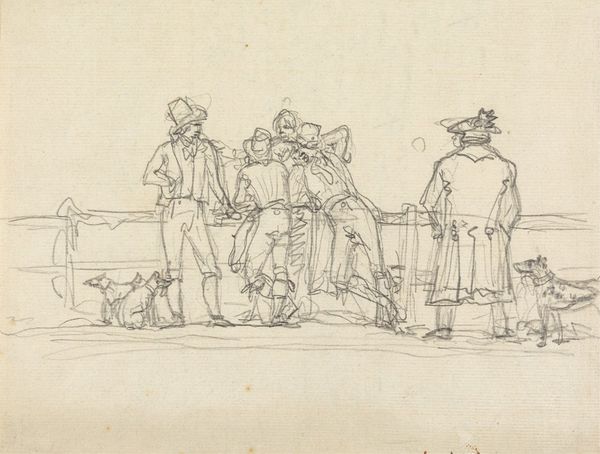 Editor: This is "Family, father drinking tea (?),” by Pieter Bartholomeusz. Barbiers, made sometime between 1782 and 1837, using pen and ink on paper. It has the spontaneous quality of a sketch. What story do you see unfolding in this piece? Curator: I see a snapshot of domesticity charged with the social tensions of its time. Genre painting, particularly during this period, often served as a moral mirror to society. Look closely – the father gestures, perhaps instructing or reprimanding. How does that power dynamic impact the other family members present? Editor: Well, the mother seems fairly disengaged and the child looks away from the father's gesturing arm. Is the artist trying to make a statement about family dynamics? Curator: Precisely! Consider the position of women and children within the 18th and 19th-century Dutch household. Were their voices valued equally? Notice the father's attire – how might his clothing reflect his social standing and authority? Editor: It does suggest a certain authority…I hadn’t considered the clothing in that way. Curator: These visual cues prompt us to reflect on gender roles, class structures, and familial power dynamics that were part of everyday life, but were also intensely negotiated. This "sketch" may appear simple, but it subtly critiques the social norms that confined people within rigid structures. Editor: It’s amazing how much social commentary can be packed into what I initially perceived as just a simple sketch. Curator: Absolutely. Art offers opportunities to investigate, discuss, and perhaps even challenge such hierarchies, even within the intimate sphere of family. That invitation to question remains relevant today.