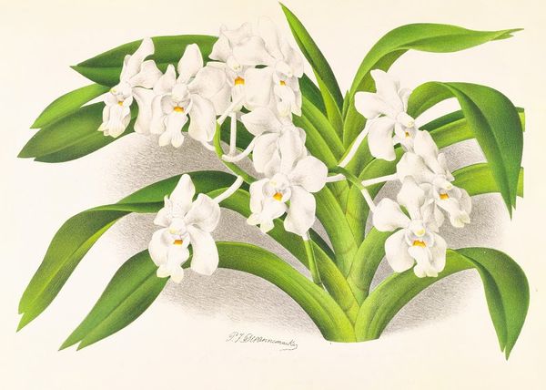 Curator: Well, isn't that something. Just looking at it, there's an odd blend of something so vulnerable but somehow fierce with it. Editor: Indeed! This watercolour painting is entitled "Phalaenopsis luddemanniana", thought to be created between 1885 and 1906, and it's by Jean Jules Linden. Its meticulous execution reflects the style of academic art. The attention to detail on display elevates the scientific to something sensual. Curator: It feels so precise, so intent on showing off nature's meticulous handiwork. You almost forget a person created it. And the composition…everything pulls your eye right to those gorgeous blooms, almost dizzying! But somehow soothing? Editor: The painting directs attention via a central focal point and strategic dispersal of colour. Note the leaves, they act as vibrant framing devices, creating both a visual grounding and an emphasis on the pink and white blossoms, which contrast nicely against the deep green. Curator: That pink, though. I see so much passion, such life force, even, like its trying to whisper to me. Also I really appreciate the way Linden captured how the roots sprout from the plant as well. I feel like, in addition to capturing a botanical specimen, it also communicates an ecosystemic process. Editor: Yes, this choice is compositionally important; those twisting roots add movement, grounding the more airy petals. The plant hovers on the page, a scientific study captured using delicate watercolor techniques to emphasise line and surface. It reminds me of some ideas I've had involving rhizomatic systems. Curator: So, what I gather, even if one might initially be skeptical of a mere plant painting, that doesn’t make it simply descriptive. There are complex ways this is expressing itself. Almost dream-like to a certain extent. Editor: I agree. While academic in style, the rendering invites interpretation of not just nature but artistic perspective itself. Its rigid control paradoxically enhances its lyrical impact. Curator: Thanks for clarifying this for me, this painting really gave me something to think about. I may just become an orchid enthusiast myself! Editor: Absolutely, I hope you find it intellectually as stimulating as I do, happy observing!