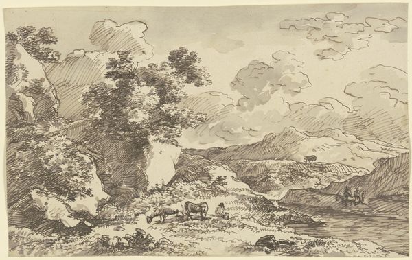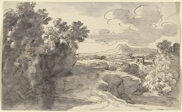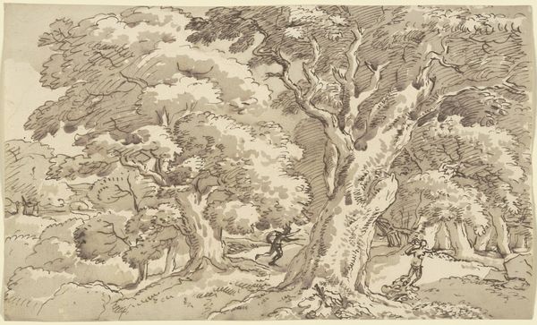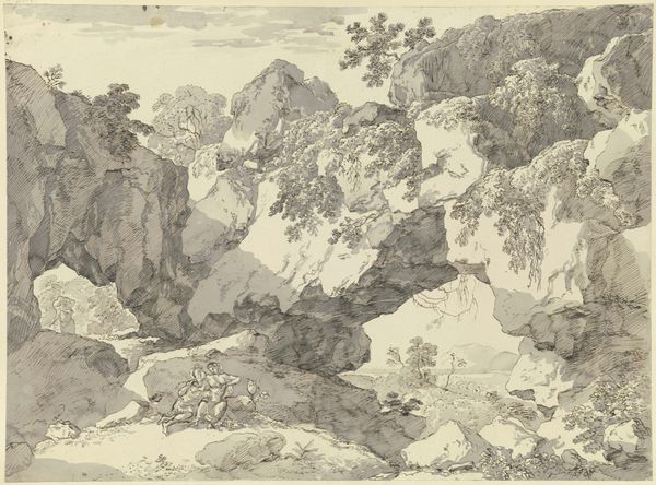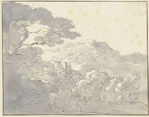 Editor: We're looking at Johann Georg Wille's "Two Children Seated near Overgrown Ruins," created in 1758 using ink and pencil. There's a sense of melancholic beauty in this sepia-toned drawing... almost like nature is reclaiming a forgotten past. What layers of meaning do you see here? Curator: It’s compelling how Wille uses the ruins not merely as background, but as a silent commentary on power and impermanence. Consider the children: are they playing, or are they seeking shelter amidst societal decay? How might their gender and class intersect with this setting of historical decline? Editor: I hadn't thought of it that way, that they are seeking shelter. Is it reaching too much to view them almost like refugees? Curator: Not at all. By positioning the children in such proximity to the ruins, Wille evokes a sense of displacement, both physical and perhaps existential. What socio-political events might have informed his perspective at the time? Consider the Seven Years' War that started just two years prior. Editor: The war! So the crumbling architecture could symbolize not just a distant past, but a very real present for Wille. It gives a sense of urgency and commentary I would have otherwise missed! Curator: Precisely. And through this lens, we see how art becomes a mirror reflecting societal anxieties and a call for a more just world. Editor: I’m leaving with so much to think about now! It's incredible how historical context illuminates even seemingly simple landscapes. Curator: Indeed. And understanding those contexts allows us to truly engage with the artwork's power to question and challenge.