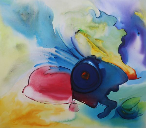 Justin Earl Grant created "Caravana de los sabios" in 2024 using watercolor. A dominant black background sets a dramatic stage for softer washes of color. Grant uses layering and transparency. Blues, reds, and yellows interplay, creating depth and visual interest. The eye is drawn to the central circular form, a vortex of swirling lines and diffused colors. This may act as a focal point that suggests movement or transformation. The washes of color create a dream-like quality, blurring the distinction between figure and ground. The lack of defined forms invites interpretation. Does the painting reflect an exploration of inner landscapes, where emotions and thoughts blend? The title suggests a journey of knowledge, so perhaps the painting is an exploration of the abstract space where ideas evolve, or a visual metaphor for the mind. Ultimately, Grant's work uses the fluidity of watercolor to create an experience that prompts us to reflect on the nature of perception and understanding.