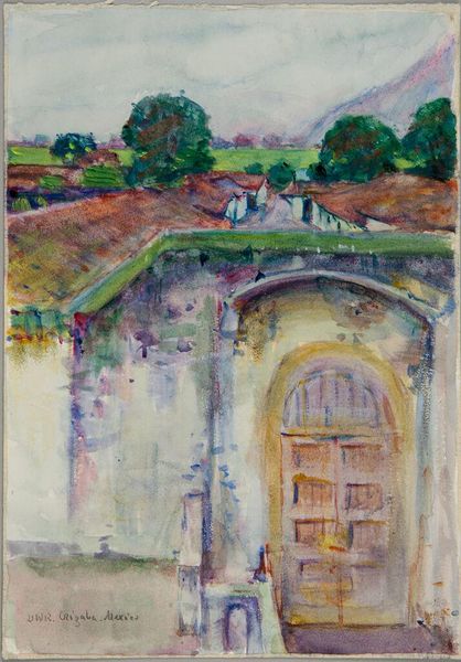 Editor: This is "Orizaba, Mexico" by Denman Waldo Ross, housed at the Harvard Art Museums. It's a watercolor piece, and the layering of colors creates a hazy, dreamlike impression. What compositional elements strike you most? Curator: The structure is compelling. Ross employs a high vantage point, organizing the composition into distinct planes. Note how the architecture in the mid-ground anchors the composition with its geometric solidity, contrasting with the organic forms of the foliage. Editor: So, the interplay of geometric and organic shapes is key? Curator: Precisely. The facade in the foreground with its linear balustrade leads the eye toward the domed church. It's a visual dialogue that underscores the relationship between man-made structures and the natural landscape. Editor: I see it now! Thanks for pointing out those relationships. Curator: Indeed, analyzing these formal elements enhances our appreciation.