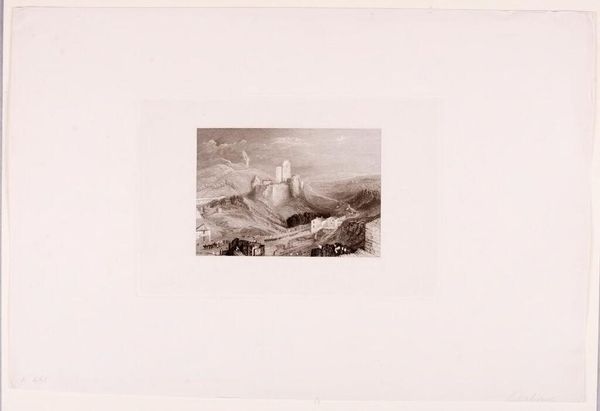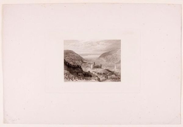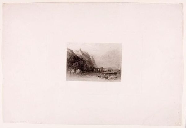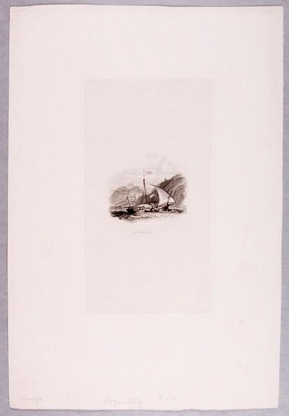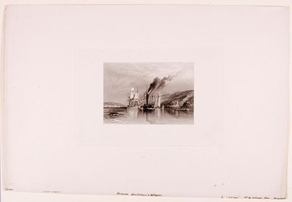 Curator: Look at this print, titled "La chaise de Gargantua", by Robert Brandard. What strikes you about it? Editor: Oh, wow. The lightning bolt steals the show, doesn't it? It's like the whole scene is holding its breath. Curator: It's fascinating how Brandard uses etching to capture that atmospheric tension, especially considering the printmaking processes of the time. The labor involved in producing these plates... Editor: The boats huddled together, the stormy sky, it feels straight out of a fever dream. I love the drama of the sky. Curator: Right, think about the distribution of these images too; making art accessible beyond the elite was revolutionary. Editor: True! Brandard really did give everyone a front-row seat to a spectacular storm. It does make one think of power, both natural and human. Curator: Indeed, and considering the means of production, it makes me appreciate the artistry even more. Editor: Absolutely. It's a moment captured, full of drama and, dare I say, a touch of poetry.
