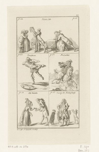 Editor: This drawing, “Twee afbeeldingen van Ajax,” created sometime between 1709 and 1771 by Laurent Cars, presents two depictions of the Greek hero Ajax. I find it interesting how one panel shows him almost defeated, with outstretched arms, while the other shows him ready for battle. How do you interpret this work? Curator: Indeed. Note how Cars gives us two sides of the same hero – the vulnerable and the valiant. But observe closely; each Ajax embodies different *cultural* memories of heroism. One figure is "d'Homère," referencing Homer's *Iliad,* emphasizing Ajax's tragic flaws and human suffering. His discarded shield and open arms speak of defeat, yes, but also raw emotion. Editor: So it's not just a story of bravery? Curator: Precisely! Now, look at the second Ajax, "de Longin." He is armed, stoic, seemingly invincible. This references the Greek writer Longinus, but the specific association with Ajax isn’t so clear. Longinus spoke on literary heroism, elevating Ajax beyond the Homeric version. Each rendering functions as a visual key, unlocking specific cultural interpretations. Do you see how these images present not just a warrior, but an evolving *idea* of heroism? Editor: That makes so much sense! One embodies vulnerability and human fallibility, while the other is the stoic, almost idealized hero. Curator: The beauty of studying iconography is witnessing this cultural memory made visible. Laurent Cars's drawing gives us a visual language, reminding us how stories and symbols reshape our understanding of iconic figures like Ajax across generations. Editor: I see that the two depictions showcase cultural memories, and the use of symbols from past writings enrich its understanding. Thanks for revealing a different viewpoint.