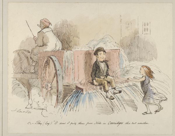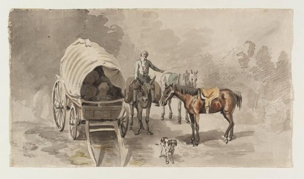 Editor: Here we have Cornelis Springer's "Coach and figures in seventeenth-century clothing," likely created sometime between 1846 and 1882, using drawing and mixed media, including watercolor and colored pencil. The overall effect feels a bit like a quick sketch, capturing a moment in time. What's your take on this, focusing perhaps on the process of its making? Curator: Well, first, note the deliberate mixing of media. Springer isn’t just presenting an image; he’s experimenting with materiality. This mixing of media invites us to consider the labor involved, both his own and the implied labor of the figures represented. Consider how the carriage itself, the luggage, speak to consumption and social hierarchy of the period, both his period and the one depicted. Editor: That's a compelling way to frame it. The visible sketch lines do add a sense of immediacy, almost like witnessing the scene unfold. But does this approach flatten the distinction between "high art" and mere craft or illustration? Curator: Precisely. Springer's method pushes us to reconsider those traditional boundaries. It begs the question: where does observation end and construction begin? His choices regarding the tools and his rapid execution suggest a critical awareness of the commercial art market of his era as well, making it possibly more accessible to wider audiences, even if the scene depicts elites. Editor: So, in choosing these media, Springer potentially democratizes a depiction of the upper class? I hadn't thought of it that way. Curator: In a sense, yes. By emphasizing process and materiality, he subtly subverts the traditional art hierarchy, bringing it closer to earth, no longer divine or removed. Editor: That's fascinating. It really shifts how I see not just the artwork, but also the role of the artist and the culture that makes the art relevant.