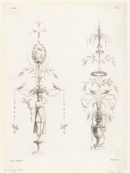 Laurent Guyot’s drawing offers two studies in arabesque design, rendered with delicate lines and monochromatic washes. The designs, intended perhaps for textiles or wallpaper, evoke a sense of Rococo elegance and intricacy. The formal structure is based on symmetry; each arabesque unfolds vertically with balanced, ornate motifs. Notice how Guyot uses line to create a rhythm of ascending and descending forms, guiding the eye through a visual dance of leaves, vases, and architectural elements. This ordered symmetry provides a sense of harmony. The drawing isn't just decorative; it embodies the Enlightenment's pursuit of order and reason, but softened with a playful, ornamental touch. Look closely and you'll notice the contrast between the rigid structure and the organic forms. It is a visual metaphor for the era's attempt to reconcile the natural world with the artificiality of courtly life. The arabesque, with its blend of natural and man-made elements, destabilizes the boundary between the two. It questions fixed categories, inviting us to consider the interplay between nature, artifice, and design.