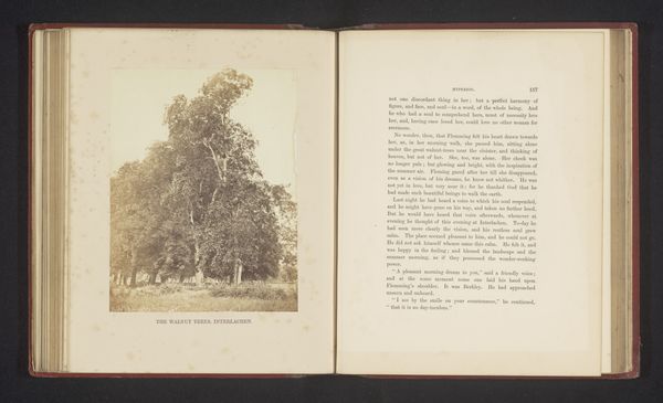 Curator: We are looking at a work entitled "Landschap nabij Genk" – "Landscape near Genk," if you will – by Édouard Adelot, dating from before 1901. Editor: My first impression is melancholy. The sparse trees, almost silhouetted, lend a certain quiet desolation, particularly in this monochrome rendering. The tones are muted, as if light is struggling to penetrate the scene. Curator: As an image within a book, its placement contributes to that feeling. Consider the turn of the page: a shift, a revealing. Does the image echo what’s being written on the opposite page, or contrast with it? Is it a meditation on isolation, captured at a specific moment in the late 19th century? It suggests both physical location and perhaps, something internal. Editor: From a purely formal standpoint, note how the strong verticality of the tree trunks divides the composition into almost rhythmic segments. This countered by a low horizon line creates this tension that both constricts and elevates the limited pictorial space. Look too, how the textures shift, particularly the blurred almost featureless horizon. Curator: The sparseness you describe…it amplifies the impact, making those slender trees all the more resonant. Genk itself, as a location, was an area known for its heathland landscape that did, indeed, attract many artists interested in portraying nature in its more elemental, austere forms. Editor: Exactly, the composition and tonal range work synergistically. It feels like it seeks to evoke, rather than represent literally; an attempt at communicating emotional, or psychological affect through pure landscape form. It achieves this through the reduction, more is less here, which creates something strangely powerful. Curator: So, a landscape becomes a kind of symbolic space, reflecting a certain mood of that era, both environmental and psychic. Thank you for guiding our awareness into how something austere can convey such feeling! Editor: A rewarding landscape, made powerful by the way Adelot harnessed formal tools to convey what cannot always be easily seen. Thank you!