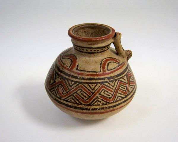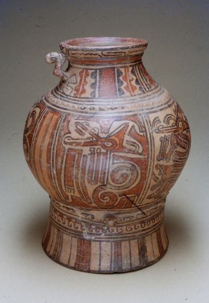 Editor: Here we have a ceramic "Storage Jar" made around 2300 BCE, by the Majiayao culture. It's amazing to see something so functional, yet so thoughtfully decorated with these geometric patterns! What can you tell us about the context surrounding its creation? Curator: Let’s focus on the process, starting with the clay itself. This earthenware tells a story about the earth from which it came, the hands that shaped it, and the fire that hardened it. Consider the labor involved, the time investment, and the specific tools and techniques used. Editor: That's interesting, I never thought about the actual labour and time investment. But wouldn't decoration also play an important role for them? Curator: Certainly, but even the decoration reflects material constraints. The pigments used – probably derived from readily available minerals – dictated the color palette. The geometric patterns weren't just aesthetic choices; they might have been the most efficient way to decorate the curved surface with the tools they had. Think about the social implications – was this pottery produced by specialized artisans or made within individual households? Editor: So, even the artistry comes down to available technology and resources. Curator: Exactly! Furthermore, considering the function as a "storage jar" encourages us to ask what exactly was stored, how access to these materials impacted diet or trade, and how the vessel might connect to community survival. How does its materiality differ from today's storage options and impact patterns of use? Editor: I suppose understanding that makes me appreciate even more what such an early work communicates about available technologies. Curator: Absolutely. And by considering production methods, use, and cultural role, we can begin to challenge boundaries between art and craft, looking at labour, material reality, and consumption patterns across different periods. What do you think the future holds? Editor: Thank you. Looking through the lens of materiality adds depth and a critical new perspective on what ancient artisans had to work with!
