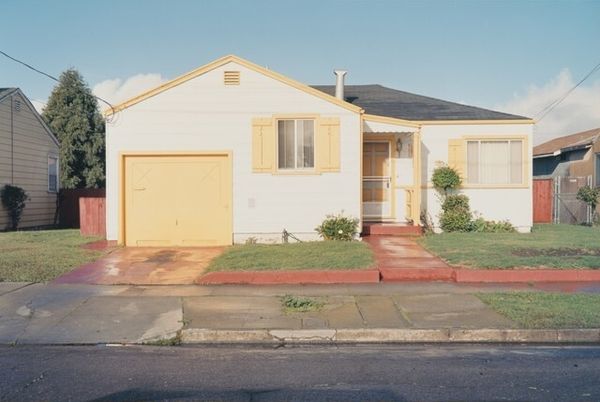 Curator: This is "Real Estate #912214," a photograph taken by Henry Wessel in 1991. Editor: Immediately, I’m struck by the flatness. It feels so…unromantic. Almost aggressively ordinary in its subject matter. Curator: Ordinary is perhaps the point. Wessel's work often focuses on seemingly mundane aspects of the American landscape, elevated through careful composition and attention to light. There’s a stillness here, isn’t there? Editor: Absolutely. Look at the light, how it sculpts the simple architecture, highlighting the pink trim. The house itself seems almost ghostlike, faded. But the lines of those overhead cables add an unsettling edge. How was it produced? I'm curious about his materials here. Curator: Wessel primarily used a Leica rangefinder camera. The images often evoke similar images in American cinema around that time: the lonely suburban uncanny, the alienation lurking in plain sight. The house as both a promise and a burden. Editor: It’s true that the house has a peculiar significance in the American psyche. I wonder if his decision to frame the house head-on, so starkly, isn’t a commentary on the real estate market itself. The materiality is slick, yet it depicts the run-down: A curious relationship. Curator: The title reinforces that idea of objectification, doesn’t it? “Real Estate #912214” reduces the home to a mere commodity. A piece of property detached from any real human presence or warmth. It's more an emblem than an abode. Editor: And yet, someone lived here. I can almost feel the labor etched into those faded boards. There’s a silent story embedded in this everyday structure and the material processes, isn’t it? Wessel managed to capture that contradiction. Curator: He certainly did. I appreciate how he transforms the mundane into something worthy of contemplation, making us question the deeper cultural narratives embedded within seemingly unremarkable scenes. Editor: Indeed, it pushes us to think about what's *actually* involved when turning houses into "real estate."