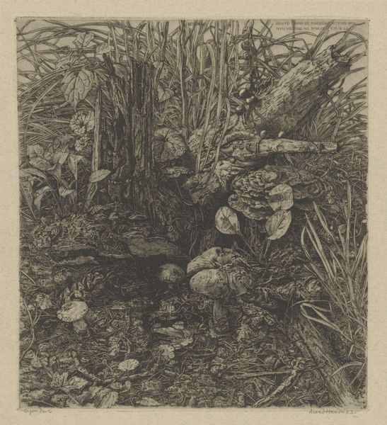 Arend Hendriks made this print, "Skull Among Flowers in a Field," using etching techniques. The symbolism evokes the vanitas tradition that still resonated in the Netherlands in the first half of the twentieth century. Here, the human skull, partially obscured by lush vegetation, becomes a potent symbol of mortality and the transience of life. Consider the historical context: Hendriks produced this work between the two world wars, amidst economic hardship, which may have influenced his artistic themes. The inclusion of flora reflects the cultural appreciation for the natural world, but here it serves as a reminder of the cycle of life and death. Hendriks likely saw this work as a comment on the human condition, perhaps critiquing the materialism of his time and questioning the institutions that perpetuated it. As art historians, we can delve into the socio-political climate of the Netherlands during Hendriks's lifetime by consulting archives, period publications, and the artist's biography to gain a more profound understanding of his work and how he was shaped by the forces of history.