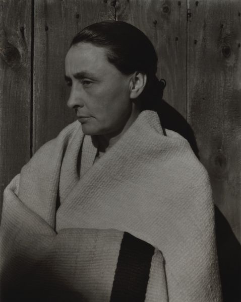Curator: Here we have Alfred Stieglitz’s portrait of Georgia O'Keeffe, taken in 1931. It’s a collotype, showcasing a different facet of their collaborative artistic relationship. Editor: The textures jump out at me—the grain of the wood backdrop juxtaposed with the soft, enveloping wool of her shawl. It feels very deliberate, like a study in contrasts using purely tonal means. Curator: Absolutely. Stieglitz meticulously crafted his photographs, seeing them as equivalent to paintings in artistic merit. His work, influenced by Pictorialism and Modernism, often elevated his subjects to icons, and O'Keeffe certainly became one. Editor: Icons are crafted, though, aren’t they? The material conditions are always present. Look at the weaving pattern of that shawl—it's almost assertive, a quiet counterpoint to O’Keeffe's own stoic profile. We forget these photographs aren’t just about "great artists"; they're about the whole process. Curator: You’re right to point that out. Stieglitz positioned himself as the champion of modern art in America, using his gallery to introduce European avant-garde to the public. Portraits like this reinforced a certain image of the artist – intellectual, dedicated, and aesthetically uncompromising. Editor: And O’Keeffe, equally aware of her image, participates in that construction. Her direct gaze and simple clothing choices contribute to a narrative of austere dedication. There's a material simplicity there that’s potent. Curator: It’s impossible to separate Stieglitz’s photographs from their role in shaping O’Keeffe's public persona, cementing her status in the art world. Consider his influence in relation to museums, collections and ultimately, the canon. Editor: Thinking about the way the light interacts with her skin – it's incredibly direct and honest. But "honesty" itself can be a calculated effect, can't it? It speaks to the cultural values placed on labor and “authenticity”, even within such a refined portrait. Curator: Examining the photograph allows us to reflect not just on the individual artists, but on how art history itself is made. Editor: And remade constantly, as we view and engage with it through our own filters, finding new textures in its meaning.