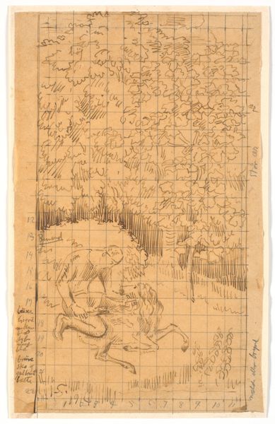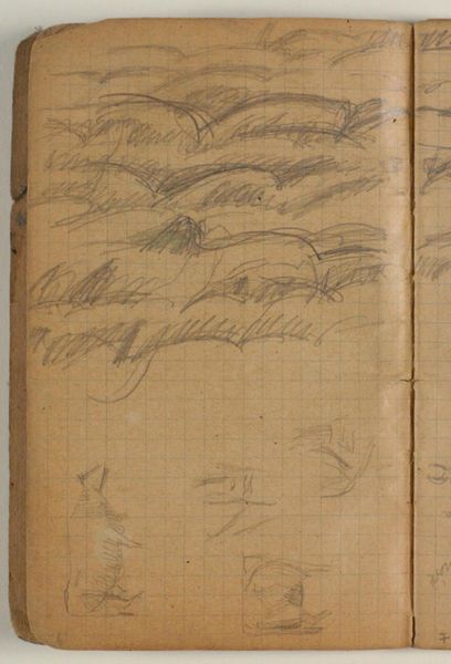 Editor: So, this is "Udkast til 'Skipper Klement ikaprer en Lybekker', kvadrering," a sketch by Niels Larsen Stevns from 1932 to 1935. It's ink on paper, and you can tell it's a preparatory study, a working out of ideas. It's a busy image. What kind of symbolism do you see in something that feels so spontaneous? Curator: Spontaneity is fascinating, isn't it? Because even in something that seems like a quick sketch, symbols are always present. Notice the ship itself. A ship often represents a journey, a quest. This journey, as indicated by "Skipper Klement," connects to historical narratives of power, conflict, and the capturing of Lübeck ships which can further suggest cultural rivalries and economic dominance. What emotions do those historical associations evoke? Editor: Well, conflict and struggle, definitely. It seems more complicated than just a sea journey. Curator: Exactly. Even the grid, that kvadrering in the title, can symbolize order, control, and the artist's attempt to contain and understand the chaos of the historical event. The sketch transforms history itself into information. Do you think the choice of toned paper impacts our reading of the symbols present? Editor: It gives the drawing a sense of age, lending gravitas perhaps? Making the event feel distant, but the act of sketching makes it alive and urgent, it is contradictory. The way marks have been added, subtracted and drawn over one another makes one conscious of time. Curator: Precisely. And what does that say about how we engage with our past and try to capture it visually? Stevns gives form to both history and cultural memory itself. It makes the invisible, visible. Editor: I see that now, I had missed the layers and cultural implications beneath the surface of the quick lines. Curator: Exactly! And understanding those layers is the joy of interpreting symbols, right?