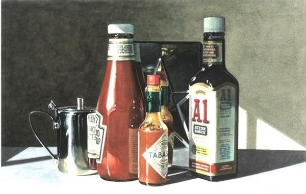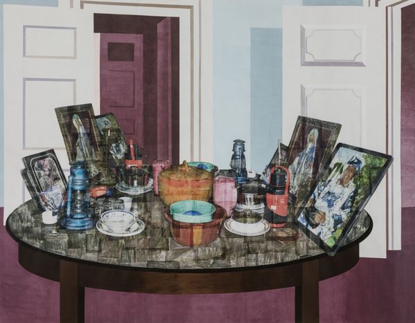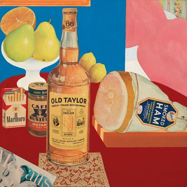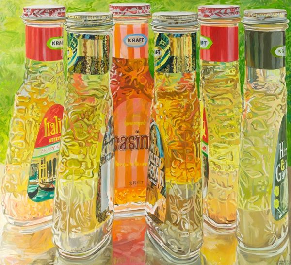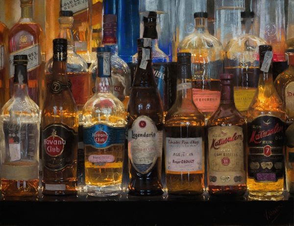 Curator: Immediately, the density and darkness of the composition give this piece, “Bottles Illuminating the Night” by Vicente Romero, a mood of both quiet contemplation and the hidden dynamics within the history of manufacturing these goods. Editor: The luminosity is incredible, isn’t it? Look at how Romero captures the light as it filters through the various liquids and reflects off the glass surfaces. He uses oil paint to create this stunning photorealistic image; a feast of textures, from the labels to the condensation. Curator: Absolutely, it brings forward complex debates around production and labor - these meticulously crafted bottles are made with particular materials, specific techniques, and intended to facilitate and signal specific types of consumption. What statements are we making about luxury versus access to basic resources when representing objects of consumption in art? Editor: The subject matter here, the specific liquor bottles, definitely invokes specific brands, histories, trade routes, and class associations. Do you see the reflections caught within the glass and liquids? These refractions act like a distorted mirror, highlighting our culture of consumerism, and also Romero's dedication to represent it faithfully using paint, brushes, and labor. Curator: Thinking intersectionally, it's crucial to also ask who gets to participate in the creation and distribution of these goods? Are there specific gender, racial, or economic power dynamics in play that are also being illuminated here? We can use this still life to unpack some historical problems of the art world - is it reproducing inequalities in its representations or critiquing them? Editor: Good points. I would also consider how the artist uses those traditions. There's a Baroque drama and precision to how the bottles are displayed. Romero brings to life contemporary realism by using materials such as brushes, canvases, oil, but not forgetting the significance of artistic skills, historical representation. He is creating a material commodity from representing commodities. Curator: “Bottles Illuminating the Night" makes me think about all these considerations and still feels unresolved about its social and artistic place within our cultural framework. Editor: Exactly, it’s a piece that leaves me with much to consider regarding the way labor is deployed both in and outside of the canvas.