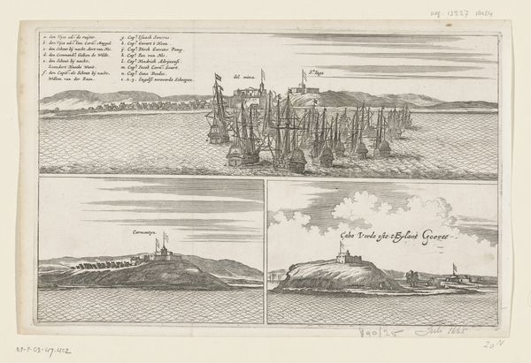 Editor: This is "In de bocht van Anjer een prauw met posthouder," possibly from 1779, by Jan Brandes. It's an ink and watercolor drawing, depicting several boats on water with landscapes above. It feels like a visual record, almost like a series of snapshots in a travel journal. What stands out to you? Curator: The drawing is like a visual mnemonic device, a means of encoding and recalling a specific place and time. Consider the boats themselves; they're not merely modes of transport. Notice the Dutch flag, and consider how the boat transforms into a floating symbol of colonial power and trade routes. Editor: That’s interesting, I hadn’t considered the symbolic weight of the flag itself. So you see these images functioning almost like…cultural shorthand? Curator: Precisely. What do you notice about the repetition of the landscape? Jan Brandes presents this serene horizontal banding. What could it represent? Editor: Perhaps a sense of… ownership? Documenting the landscape as a resource, almost claiming it through the act of observation? Curator: It hints at something more enduring, perhaps the imposition of European cartographic perspectives onto foreign lands. Does this contrast between the serenity of the landscape and the activity on the water tell you anything? Editor: Yes, it reveals this quiet assertion of control, disguised in a tranquil scene. Curator: Exactly. Brandes invites us to reflect on cultural continuity and also the complexities of Dutch colonial history in visual form. Editor: Thank you, seeing those connections helps me appreciate the cultural context. It is much more than just a travel log now.