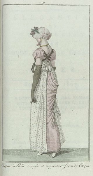 This fashion plate titled Elegantia, of tijdschrift van mode, luxe en smaak voor dames, Mei 1807, No. 11 was made in 1807 by an anonymous artist. It presents a full-length portrait of a woman in an elegant white dress. The composition is vertically oriented, emphasizing the elongated form of the dress and the figure. The stark white of the dress, with its simple lines and minimal ornamentation, reflects the neoclassical tastes of the time. It also creates a canvas against which other elements, such as the red necklace and shawl, are set off. This interplay highlights the dress's form and contrasts the textures, from the smooth fabric to the soft drape of the shawl. The plate is not merely a depiction of clothing; it embodies the era's values of simplicity and refinement. Its structure reflects a broader cultural discourse, highlighting the importance of both individual expression and adherence to societal norms. We can see this interplay in the way the figure's posture and attire conform to the aesthetic standards of the period, even as the subtle details of her clothing and accessories allow for a degree of personal style.