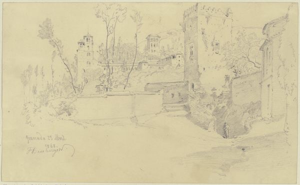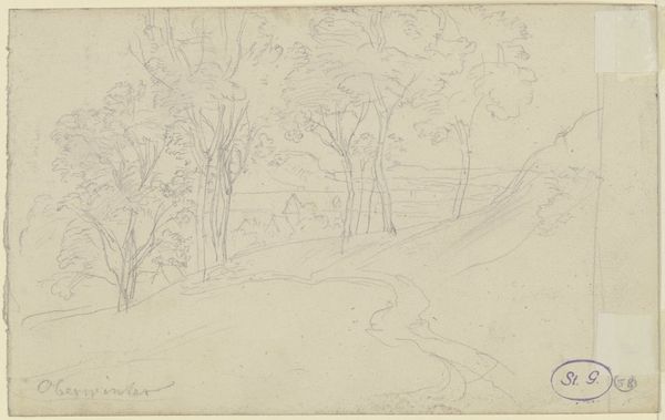 Curator: Before us we have Camille Pissarro’s “Pontoise, Les Pâtis,” created around 1868. The artwork, housed here at the Städel Museum, is rendered in pencil on paper. Editor: It has a remarkable delicacy. The faint, almost ghostly lines create a wonderfully subdued, almost dreamlike, atmosphere. Curator: Indeed. Pissarro masterfully uses the pencil to evoke light and shadow, carefully hatching to suggest form. Observe how the architectural structure of the buildings are rendered with an attentiveness. Editor: And the landscape itself, see how Pissarro integrates manmade structure within the composition of trees. He creates a unified whole, don’t you agree? What can you tell me about this suburb outside of Paris? Curator: Pontoise became a central hub for Pissarro. Leaving behind the bustling atmosphere of Paris to concentrate on a natural style. What’s interesting here is his capacity for showing the everyday, unglamorous suburbs on the cusp of France's modern future. Editor: The visible strokes speak of artistic process. You can almost trace Pissarro's steps, from the initial outline to the detailed shading that lends such a textural quality. This also comes across with the landscape's natural appearance. He’s depicting it authentically! Curator: Pissarro often chose subjects of the bourgeoisie. “Pontoise, Les Pâtis,” presents an ideal window into the landscape and the lives of his time. These humble dwellings show an era when rurality had more direct intersection. Editor: It feels very different to how society is constructed today. One has to wonder, what would Pissarro do with the modern day and all it involves? I really see his hand guiding me on a tour. Curator: What truly strikes me is Pissarro's mastery in depicting subtleties in the forms and textures by a medium like pencil. A rather elegant piece, showing how the old meets new within a city outside Paris. Editor: A meditative work. It encourages us to see the beauty and meaning inherent within daily existence in nature.