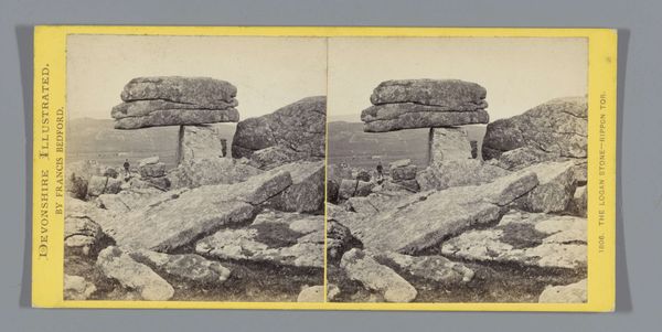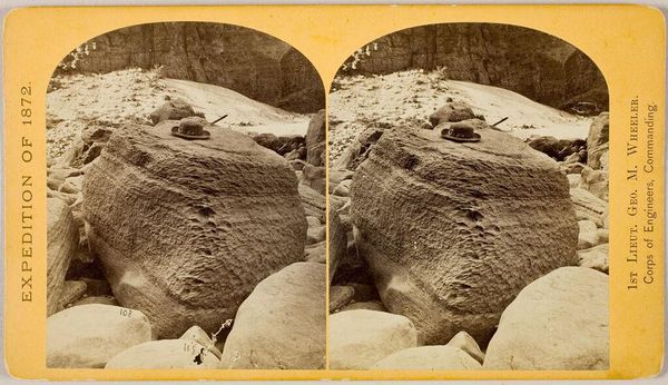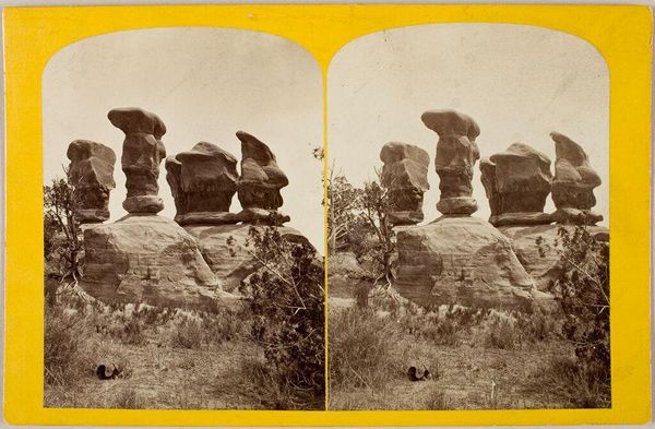 Curator: What a stark, yet elegant composition. The texture of the stone is so palpable. Editor: Yes, there's a stillness that is unsettling. It makes me think of environmental fragility. Curator: This stereograph, attributed to John K. Hillers, presents Eroded Sandstone, Kanab Canon, Utah. Note how the dual images play with depth and perception. Editor: Right, but I’m more interested in what this *shows*, which is a landscape shaped by forces, time, and erasure. The image subtly hints at Indigenous dispossession in the American West. Curator: An interesting reading. I am drawn more to the form—the contrast of light and shadow, the almost surreal architecture. Editor: It also invites reflection on the relationship between photography and power. Who gets to document, and whose stories are told? Curator: That perspective adds layers of complexity to the inherent visual interest. Editor: Precisely, seeing beyond the surface always enriches the viewing experience.