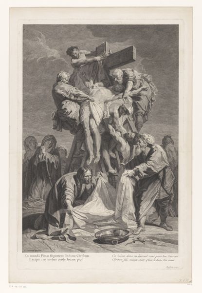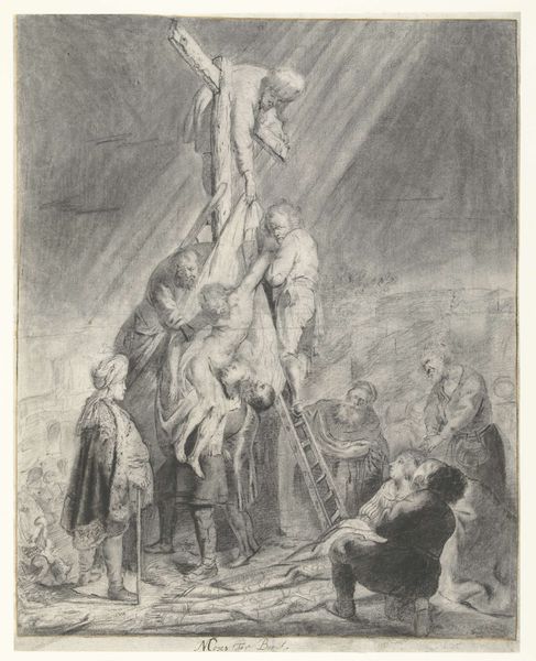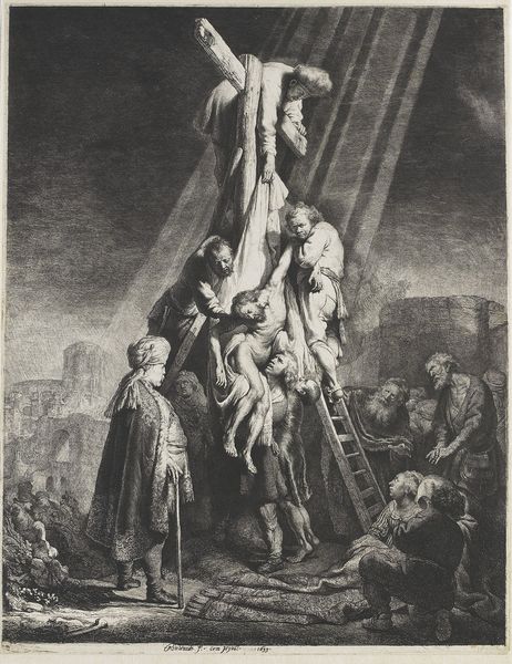 Editor: We are looking at Rembrandt van Rijn's "The Descent from the Cross: Second Plate" at the Harvard Art Museums. The stark contrast creates an emotionally charged scene. What symbols or historical context do you see reflected here? Curator: Note how the descending body, illuminated, becomes a symbol of sacrifice but also vulnerability. Consider, too, the ladder—a recurring motif for spiritual ascent and descent. Doesn't it remind you of Jacob's Ladder, linking heaven and earth? Editor: That's a great connection! It deepens the piece's emotional and religious impact. Curator: Exactly! These visual echoes reinforce the artwork’s layered meaning, linking individual suffering to collective memory.