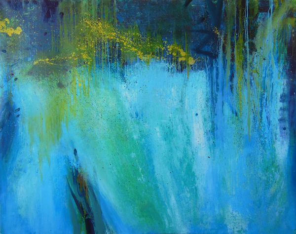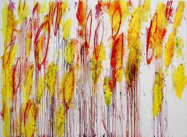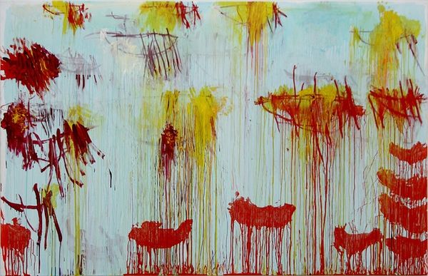 Editor: We're looking at Cy Twombly's "Lepanto, Part VII" created in 2001 using acrylic paint. I'm immediately drawn to the way the colours drip and flow. It feels chaotic but somehow balanced. What do you see in this piece in terms of its pure visual elements? Curator: Indeed, the orchestration of colour is paramount. Note how the predominantly high-key palette, that pastel ground, is punctuated by those aggressive strokes of ochre and vermillion. The verticality established by the dripping paint creates a definite, insistent rhythm across the picture plane. Editor: So, the way the paint falls isn't just random. It's actually creating a deliberate effect within the piece? Curator: Precisely. It's crucial to consider the semiotic implications of line here. These drips can be read as both a record of the artist's physical gesture and as abstract lines that interact with and define the composition's overall structure. It prompts one to ask if Twombly invites us to consider chaos or rather a highly self-conscious attempt at its orchestration. Editor: It’s fascinating to consider how those “chaotic” drips are controlled to create such interesting textures, almost as a sculptural form. Curator: In light of our analysis, how does Twombly negotiate that visual tension, between chaos and order? What visual hierarchies can you identify within the matrix of the artwork? Editor: Now, I can see that this artwork, while abstract, contains calculated and repetitive brushstrokes in very clever layering. I realize that appreciating it relies heavily on the relationships between the shapes and colour, more than a historical reference or anything else. Curator: Precisely, the material interaction and gestural articulation manifest through calculated aesthetic ordering.