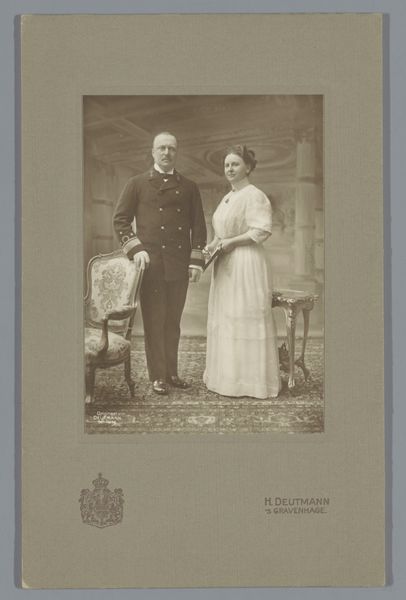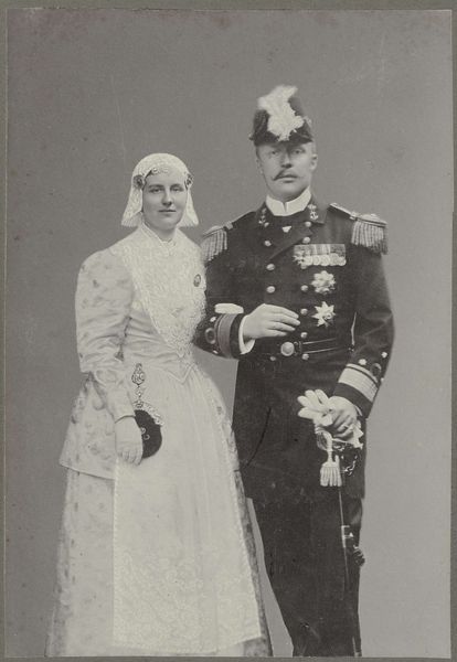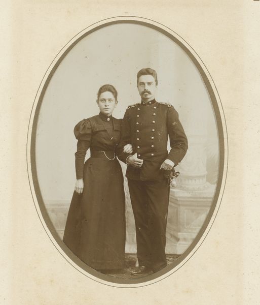 This photographic portrait of Queen Wilhelmina and Prince Hendrik, by Wegner & Mottu, presents a study in contrasts, framed within a decorative oval. The composition is immediately striking: the Queen, in a light, textured dress, stands to the left, juxtaposed against the Prince in his dark, formal military attire. The arrangement of the figures, with the Prince's arm gently holding the Queen's, creates a visual and symbolic link, softened by the curvature of the oval frame, which suggests unity. The monochromatic palette emphasizes the stark differences in texture and form, highlighting the play between light and shadow. Consider how the carefully chosen attire and the formal pose communicate dynastic power and marital alliance. This portrait transcends mere representation; it engages with visual codes that speak to broader socio-political structures and their representation through the symbolic language of photography. It is a constructed image, a carefully arranged tableau designed to convey specific messages about monarchy, gender and power.