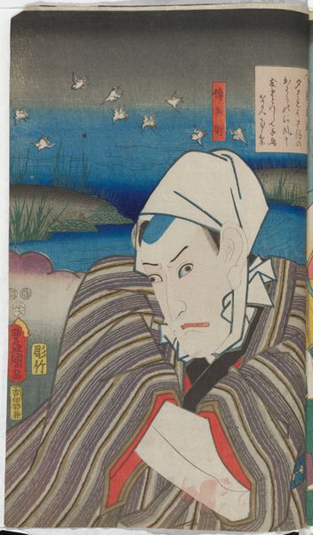 Curator: Right now we're looking at "Kakuju in Kawacho," a woodblock print made around 1852 by Utagawa Kunisada, now residing in the Rijksmuseum. It really leaps out at you, doesn’t it? Editor: Oh, absolutely, the rain. And that central figure! A theatrical sort of energy—he's almost lunging out of the picture plane. Curator: Kunisada was a master of Ukiyo-e, often focusing on portraits of Kabuki actors. The figure, likely Kakuju, a popular Kabuki role at the time. Notice how the roundel frames a downpour over Kawacho. The symbols here offer rich stories, you can imagine that behind every choice lies layers of history and meaning. Editor: The Kabuki actor’s dramatic pose is so deliberate, even in a relatively still medium. I think this speaks to the Japanese reverence for stillness, silence, or solitude even in frenzied moments of change or social upheaval. Curator: Good point! And his gaze—it seems so direct. Do you see any other repeating signs? I feel the circular designs may offer another clue… Editor: Absolutely, I find this work to be so incredibly powerful, beyond what the imagery of rain, figure or lantern alone, is trying to convey. The arrangement adds another dimension. What stands out for you when you see all this? Curator: The juxtaposition of the ephemeral, like the rain and transient nature of theatre, with something much more lasting–the woodblock medium that immortalises the moment! How about we sit with our experience of his craft? Editor: Yes, the emotionality layered in the expression seems as fresh as if he had just laid his burin down and it’s ready to spring from the block even now, all these years later. Amazing to take the trip from this world that feels somehow very new even to our ancient inner senses.