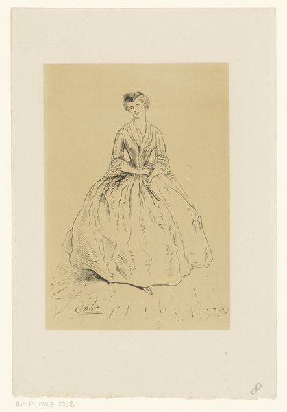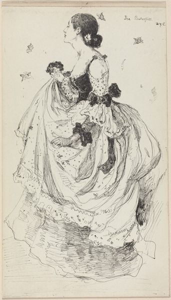 H. Robert Dammy made this print, "Journal des Dames et des Modes, Costumes Parisiens, 1914, No. 142 : Manon" with what looks like pen and ink. The lines are so delicate, so even, it’s like he’s dancing with the ink, letting it lead him across the page. Looking at it, the paper itself is part of the story. It's got this handmade quality, deckled edges, like it was torn just so. And then the dress, oh my god, it's a marvel of stripes and swirls. Some straight lines, some curved, but all working together to give you this feeling of movement, of a woman gliding through a room. Check out the way the artist has used black and white to define the form of the dress, those vertical lines are like bold strokes, anchoring the whole image. It reminds me of the fashion plates by Erté, but there's something more playful here, more loose. It's like Dammy is saying, "Fashion is art, but art is also a little bit of a joke."