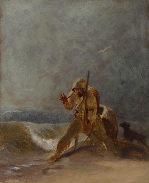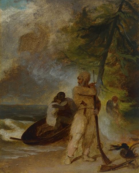 Editor: Oswald Achenbach's "Night by the beach of Naples", painted around 1880 using oil paints, captures a rather somber and contemplative seaside scene. The figures are positioned at the edge of the sea at nightfall and their body language communicates loneliness. What kind of narrative do you imagine when viewing it? Curator: Oh, the night whispers secrets, doesn't it? This piece breathes with a sense of quiet drama. Achenbach, he was a master of light, even when the light is fading. It is almost theatrical, wouldn't you agree? He sets the stage and leaves it to us, the viewers, to imagine a storyline to unfold. There are these figures perched on a rock like characters caught between worlds; what do you see in their gaze? Editor: I see anticipation, maybe longing...a touch of melancholy too? The woman is beautiful and her posture exudes self-awareness and dignity. But the pair feel disconnected. Curator: Yes! And note how the landscape reflects that emotional space, like a mirror reflecting inner turmoil. Achenbach was, in a way, composing more than just a visual experience. What about those flickers of light across the water, like distant memories? Editor: The flickering lights could suggest hope amidst the darkness? That's lovely, but it could also indicate impending danger? Curator: Perhaps, perhaps not, but a painting is nothing if it is not both things and nothing, so all that you feel is probably something intended by the artist! And he made us create those interpretations almost a century and a half later! He captures something enduring, a slice of the human experience framed by the vastness of the natural world. It is pure Romanticism. Editor: It is, you’re right! Thank you. Now I'm keen to explore more Romantic landscapes.