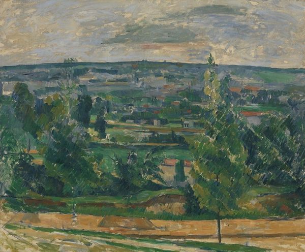 Paul Cézanne painted "Village behind Trees" with oil on canvas. The composition invites us to reflect on the relationship between nature and civilization through the distinct way a tower is placed in the composition. The tower, a structure laden with historical and cultural weight, often symbolizes power, authority, and spiritual aspiration. Here, it rises above the village, amidst nature, reminiscent of the sacred pillars of ancient Greece, such as those supporting the temples of Delphi, which bridged the earthly and divine realms. Towers have evolved into symbols of urban identity, seen in the medieval skylines of Europe, each tower marking territorial and economic power. The positioning of the tower in Cézanne's painting subtly hints at the dynamic between human ambition and the enduring presence of nature, a recurring theme in art history. It reflects our collective subconscious desire to imprint order on the world. Yet, here, the cyclical return to fundamental forms leaves us pondering the symbolic weight of human presence amidst nature's timelessness.