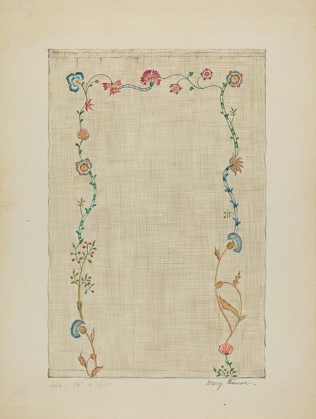 Editor: This is "Crewel Embroidery," a textile and watercolor design on paper from around 1936, created by Fanchon Larzelere. It feels so delicate and optimistic, almost like a hopeful blueprint for spring. What stands out to you in this work? Curator: Immediately, the whimsical flora grabs my attention. These aren’t literal representations of flowers; they’re inventions, aren't they? But they carry the symbolic weight of nature’s renewal. It makes me wonder, what’s the cultural memory embedded in these stylized floral motifs? Editor: You mean like, what would flowers mean to people back then? Curator: Precisely. In the midst of the Depression era, did these idealized, vibrant blossoms offer an escape, a reminder of beauty and growth even when times were hard? Are they hinting at hope, domesticity, and an ordered existence amid chaos? The artist would’ve had to select which historical memory and meaning each abstracted form holds, don’t you think? Editor: That’s fascinating. I was just seeing pretty colors, but thinking of it as a kind of coded message from that time is a game changer. The idea of “domesticity” is also super apparent now! Curator: The intention “Valance for Curtains” shows domesticity, and even then, curtains have had symbolic meanings of hiding away from the outside. The bright pastel colors really emphasizes comfort and softness. We often forget the layers of intention involved in pieces like these. These visual cues create and maintain that symbolic continuity. Editor: It’s like looking at the piece through a completely new lens. It goes beyond decoration; it's a story! Thank you! Curator: My pleasure! Always consider not just what an image shows, but what it *remembers* and *repeats*.